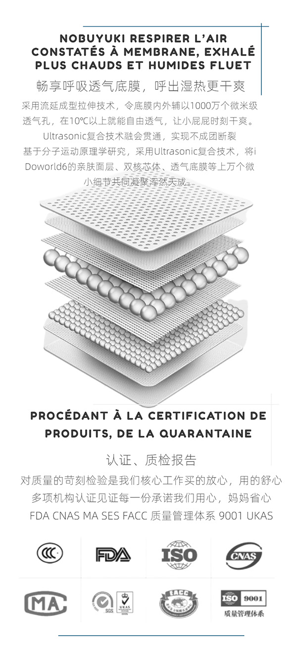 Ultrasonic復(fù)合技術(shù)融會貫通,實現(xiàn)不成團(tuán)斷裂;诜肿舆\動原理學(xué)研究,采用Ultrasonic復(fù)合技術(shù),將iDoworld6的親膚面層、雙核芯體、透氣底膜等上萬個微小細(xì)節(jié)共同凝聚渾然夭成。