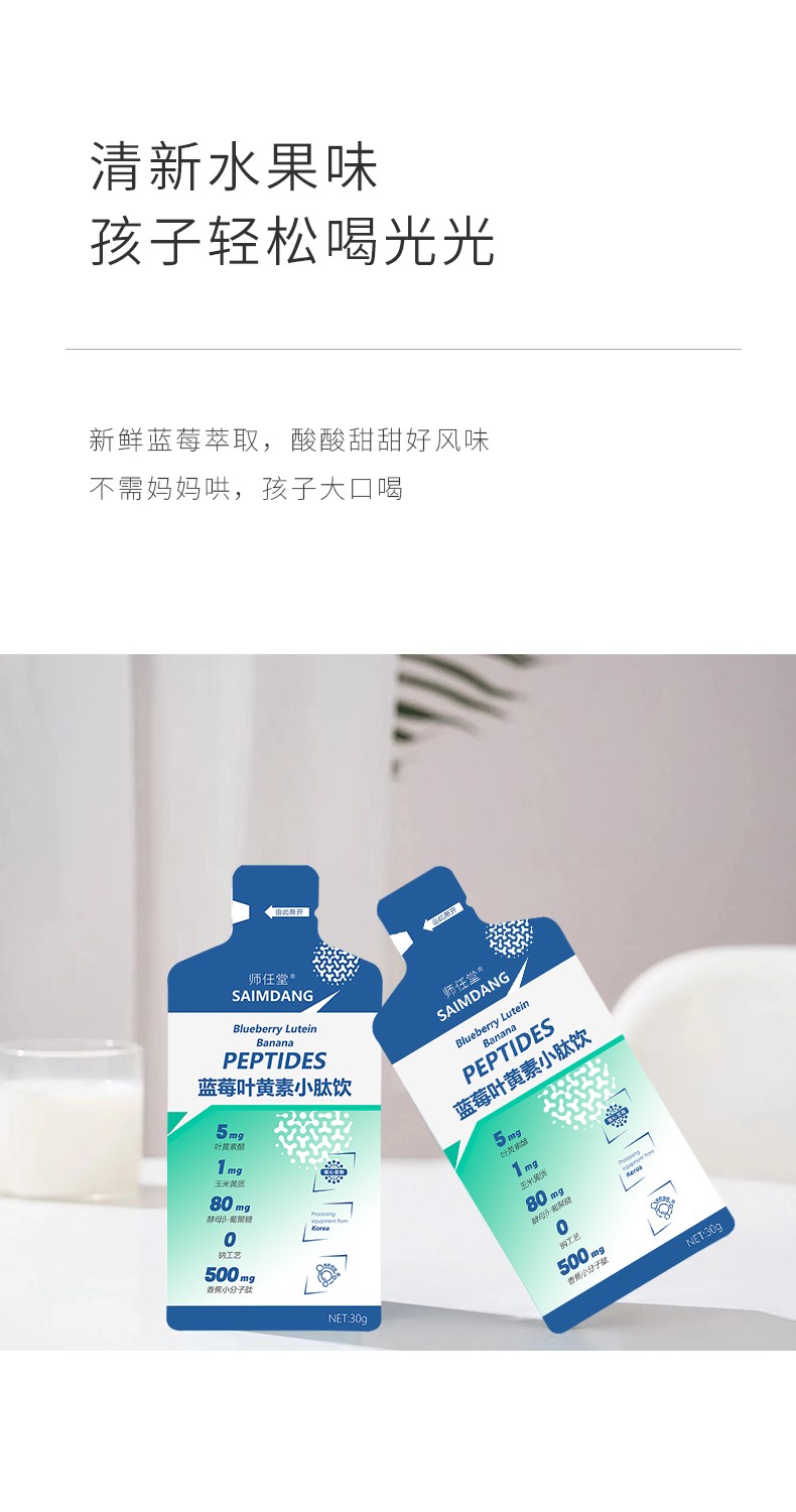 師任堂藍莓葉黃素小肽飲,少年兒童專研配方,“葉黃素酯+玉米黃質(zhì)”5:1黃金比例,科學護眼。搭配藍莓、低聚果糖(益生元)、酵母β-葡聚糖,特別添加香蕉小分子肽,多種營養(yǎng)協(xié)同補充,加倍養(yǎng)護,抵御強藍光,滿分護視力!高含量小分子肽,成分更易吸收,不增加腸胃負擔。